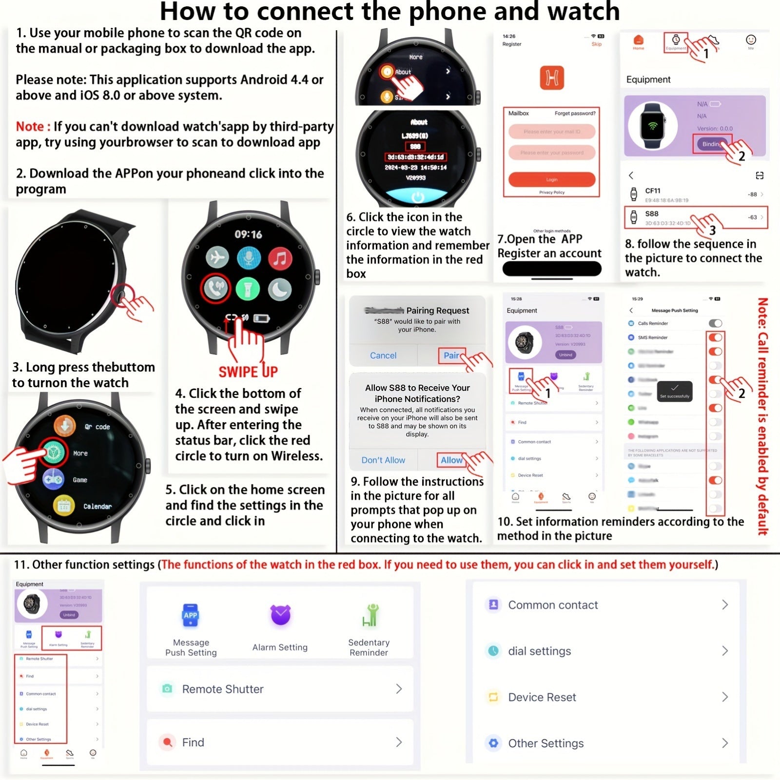 3. To download the app and link it to the watch, the mobile device must scan the QR code found in the manual. Once the connection is established, you need to activate the relevant function of the watch in the mobile app for it to operate properly. 4. The data tracked by the watch may not be entirely precise and should only be considered as a guideline.
