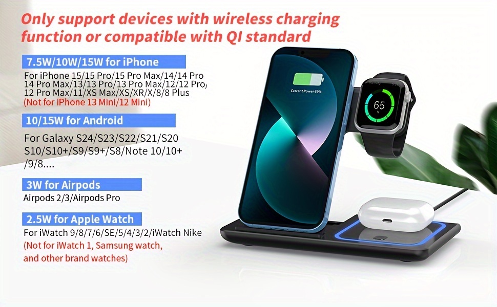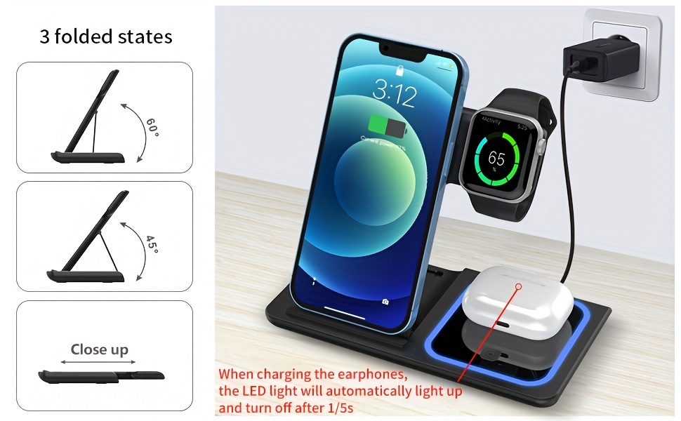 3-in-1 Fast Wireless Charging Station - Universal Compatibility for iPhone 15-8, Apple Watch 9-2, AirPods Pro 3-2 - 110V-130V US Plug Power Supply with USB-C Connector