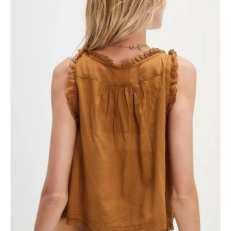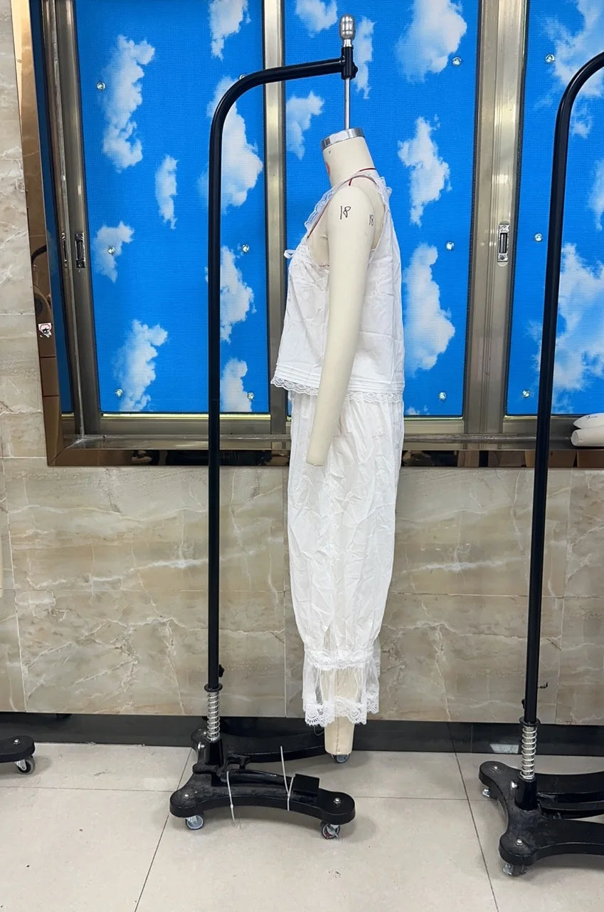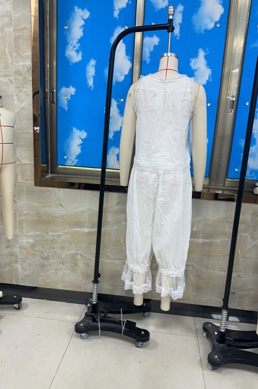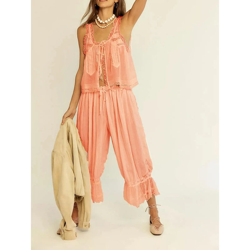 Combhasaki Women 2Pc Chic Outfits Set Floral Lace Trim Patchwork Sleeveless Tie Front Tank Vest+Drawstring Cropped Lantern Pants