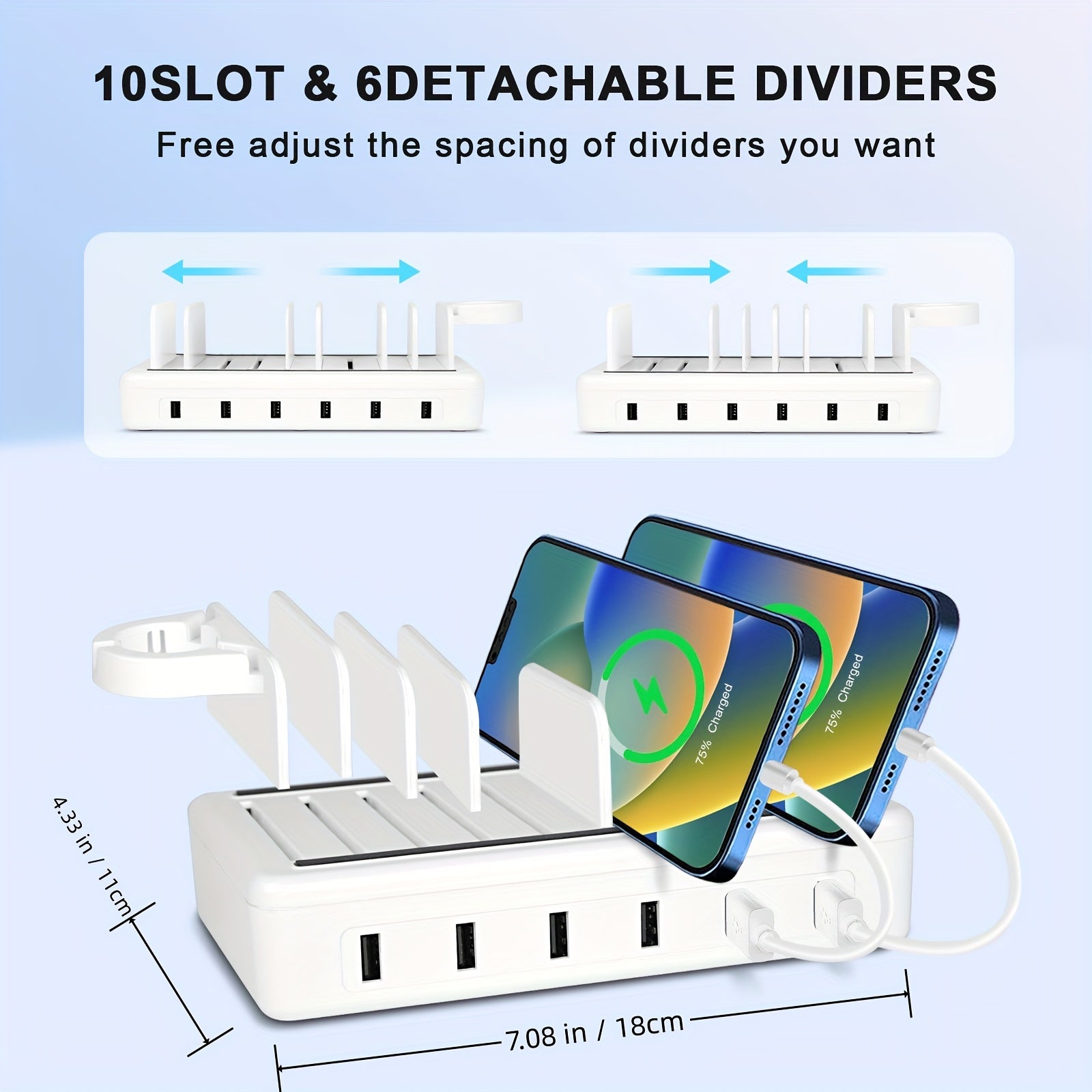Fast Charging Station For Multiple Devices, 50W 6-Ports USB Charging Station With10-Slot, Detachable Dividers, Watch Holder, Compatible With Phone/iPad/Kindle/Tablet