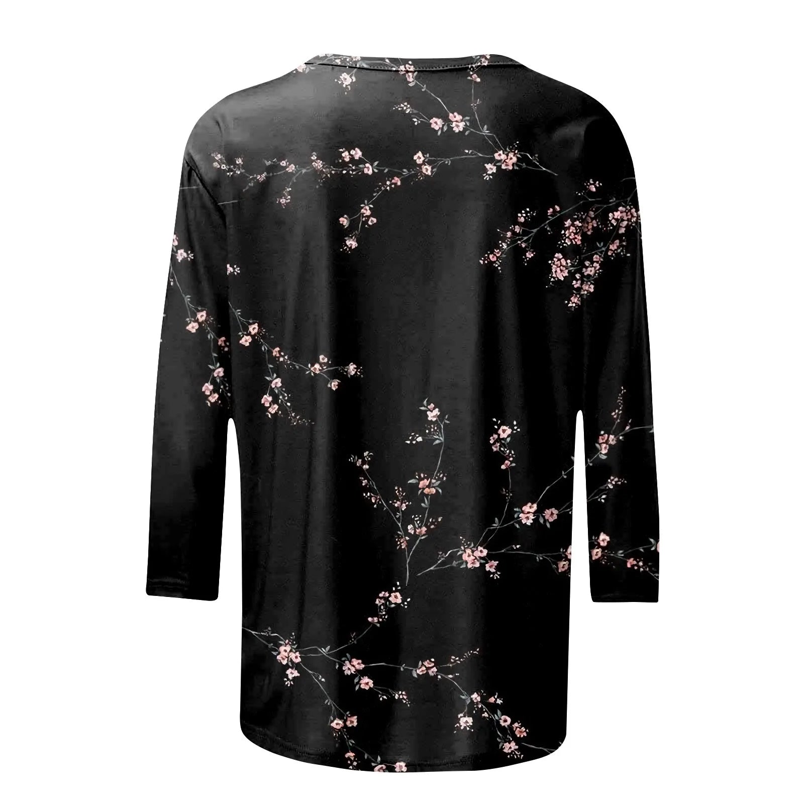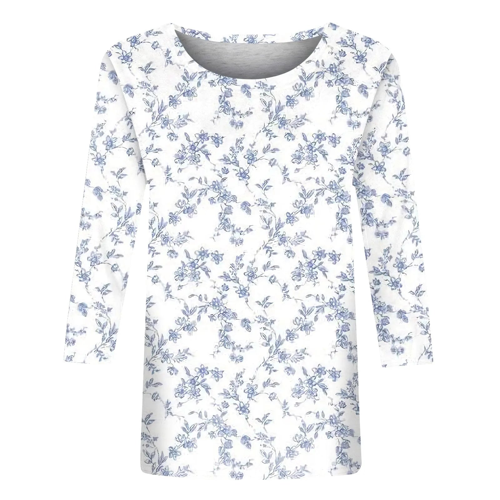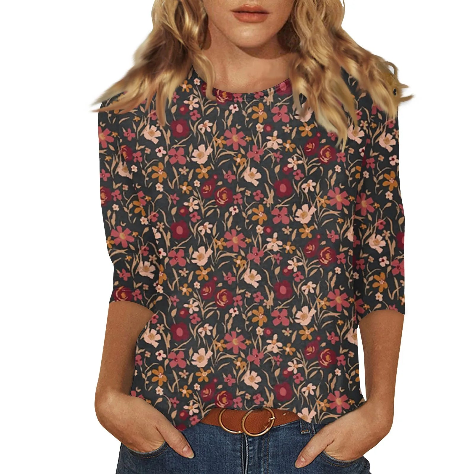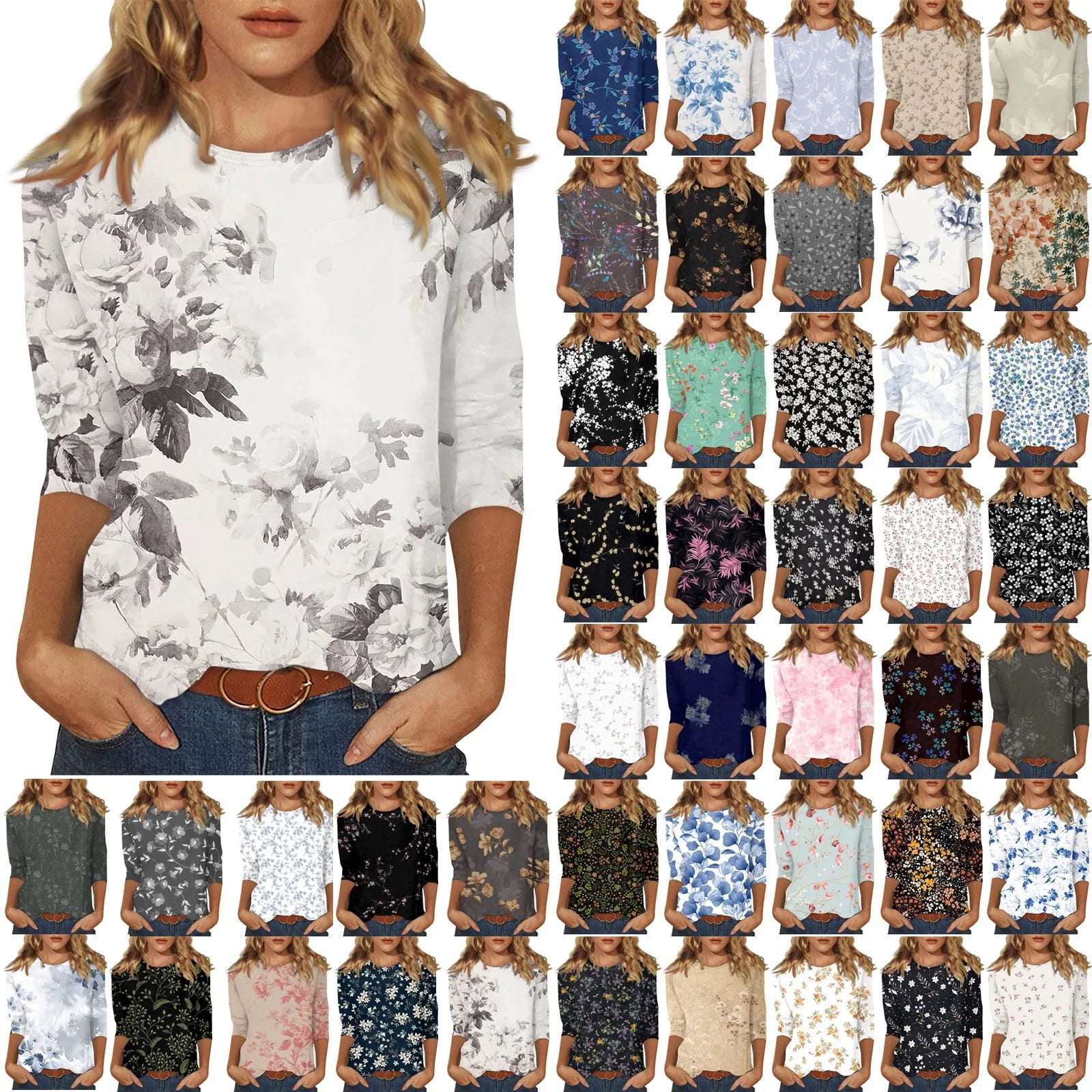 Female Clothing Delicate Fashion Shirts Floral Round Neck 3/4 Sleeves Printed Summer Women Pullover Daily Wear Vetement Femme