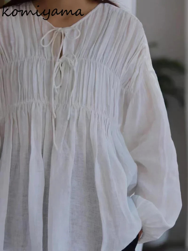 Komiyama O Neck Lace Up Shirts Blouses Vintage Elegant Pleated Blusas Mujer Spring Clothes Women Japan Fashion Shirt Tops