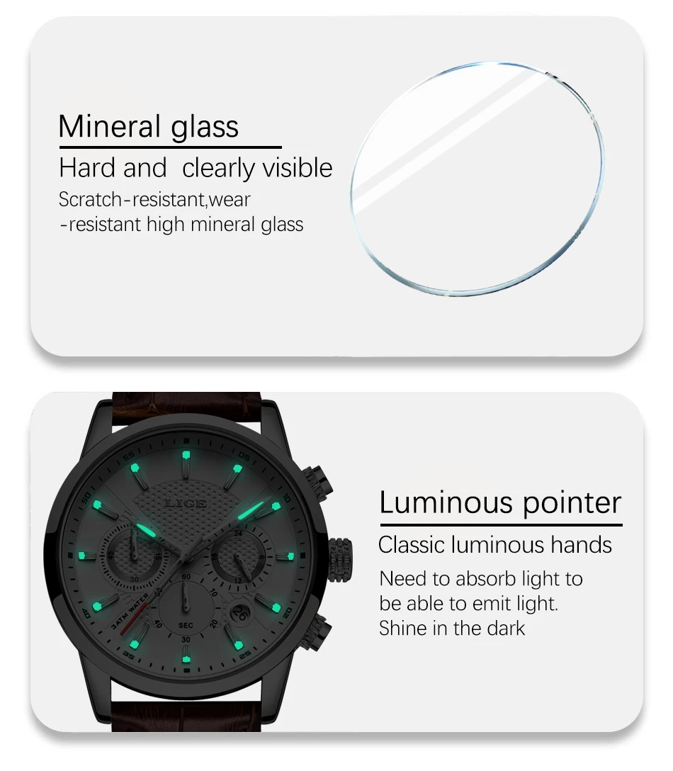 • Premium Quartz Movement :This Lige men's watch features a top-grade quartz movement, ensuring precise timekeeping and long-lasting performance.