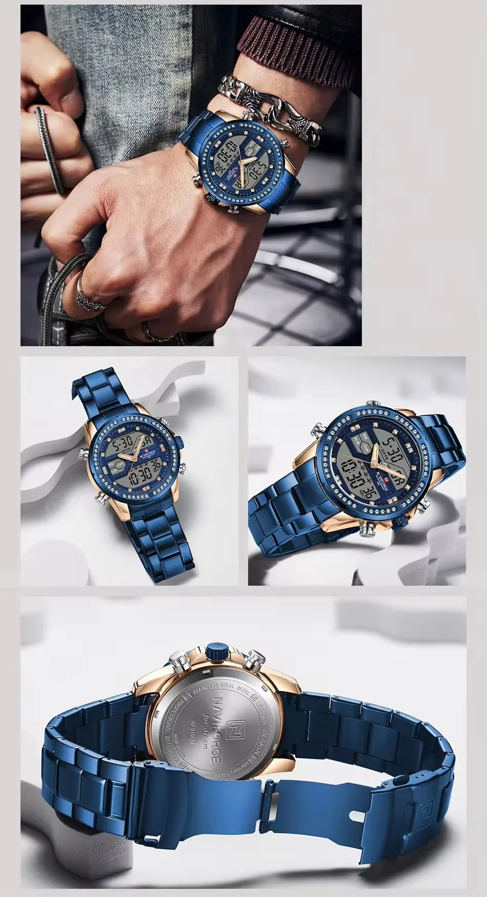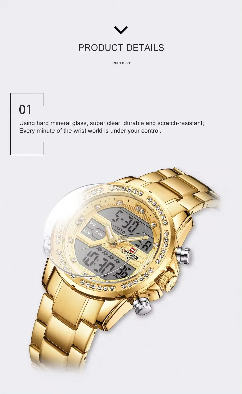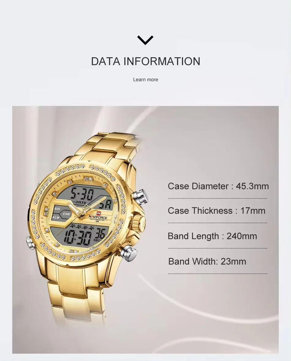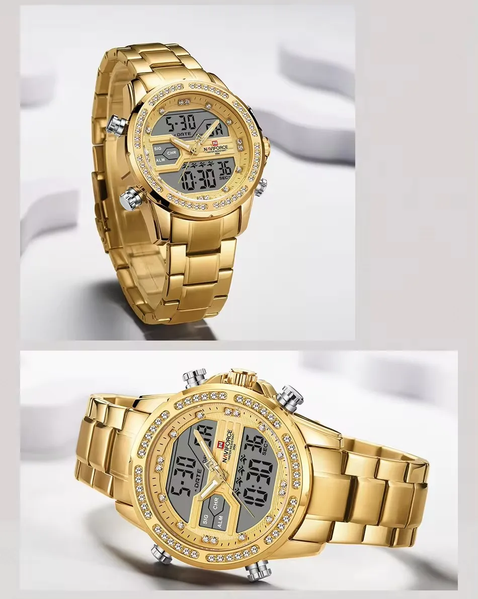 NAVIFORC Hot Sellers Waterproof Luxury Men Dual Display Gold Diamond Watches Stainless Steel Chronograph Sport Watches for Male