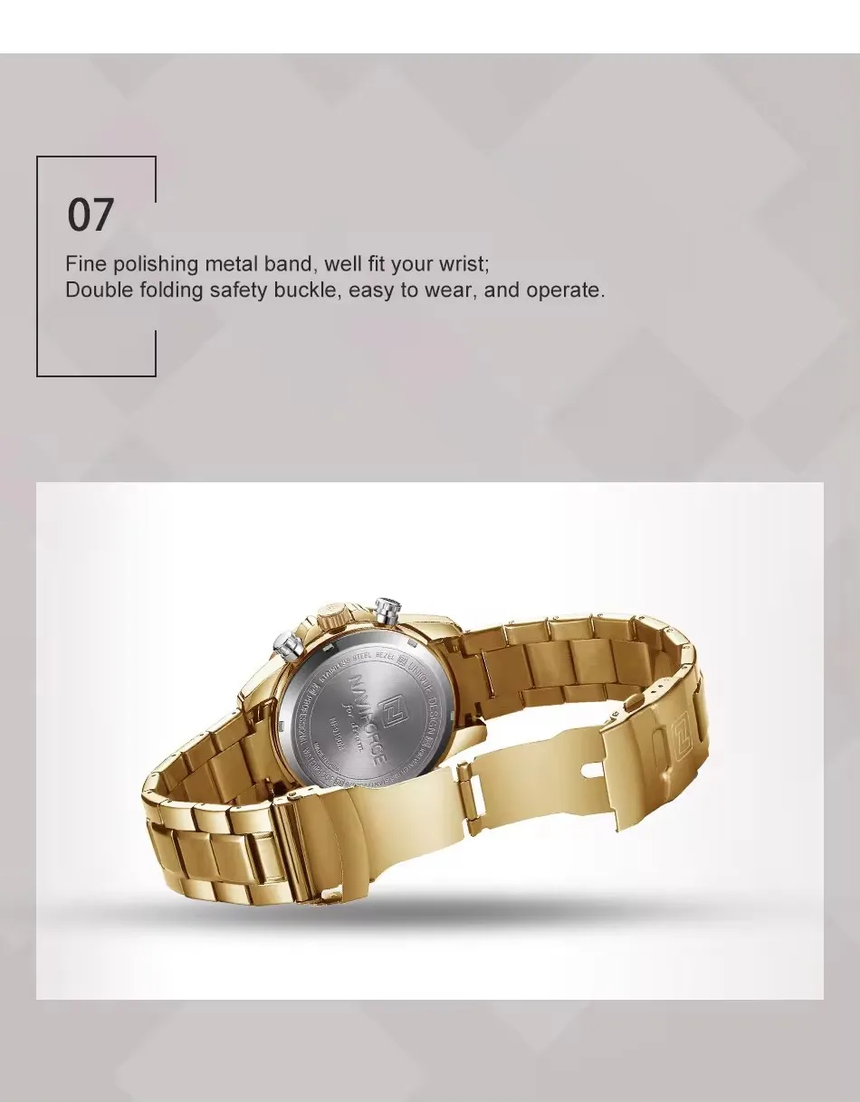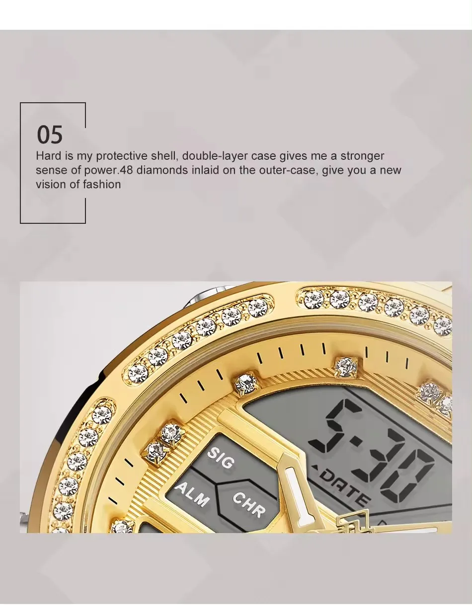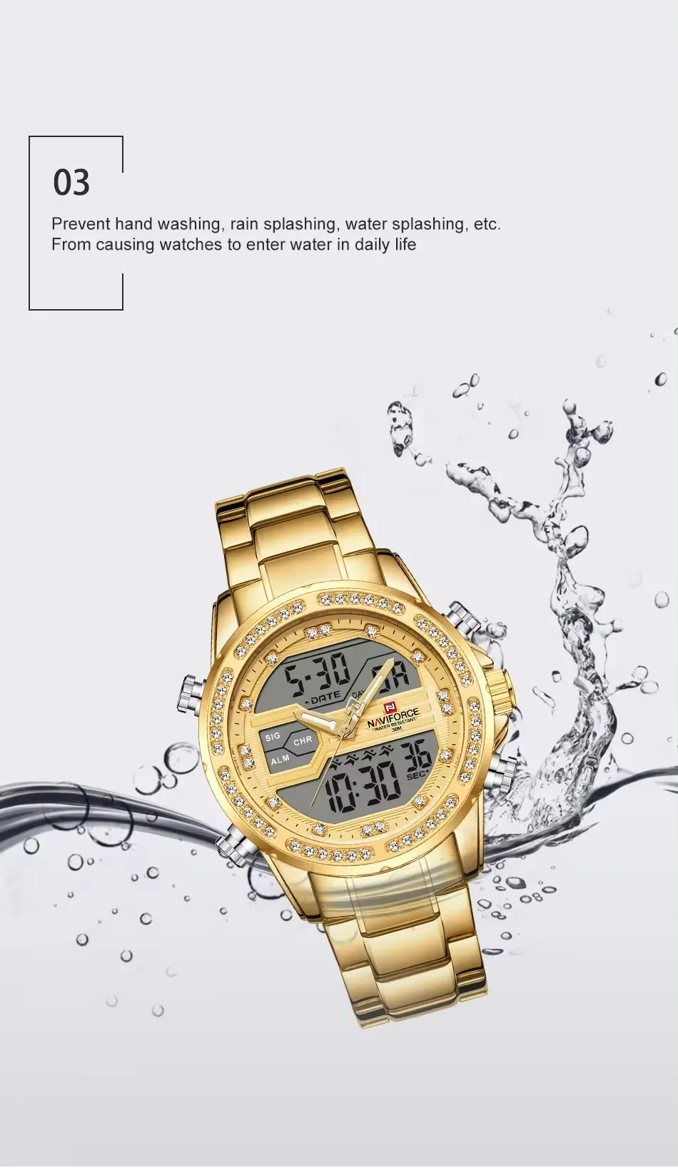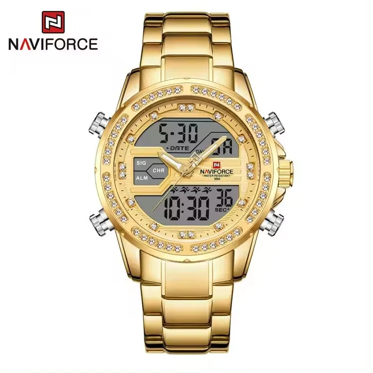 NAVIFORC Hot Sellers Waterproof Luxury Men Dual Display Gold Diamond Watches Stainless Steel Chronograph Sport Watches For Male
