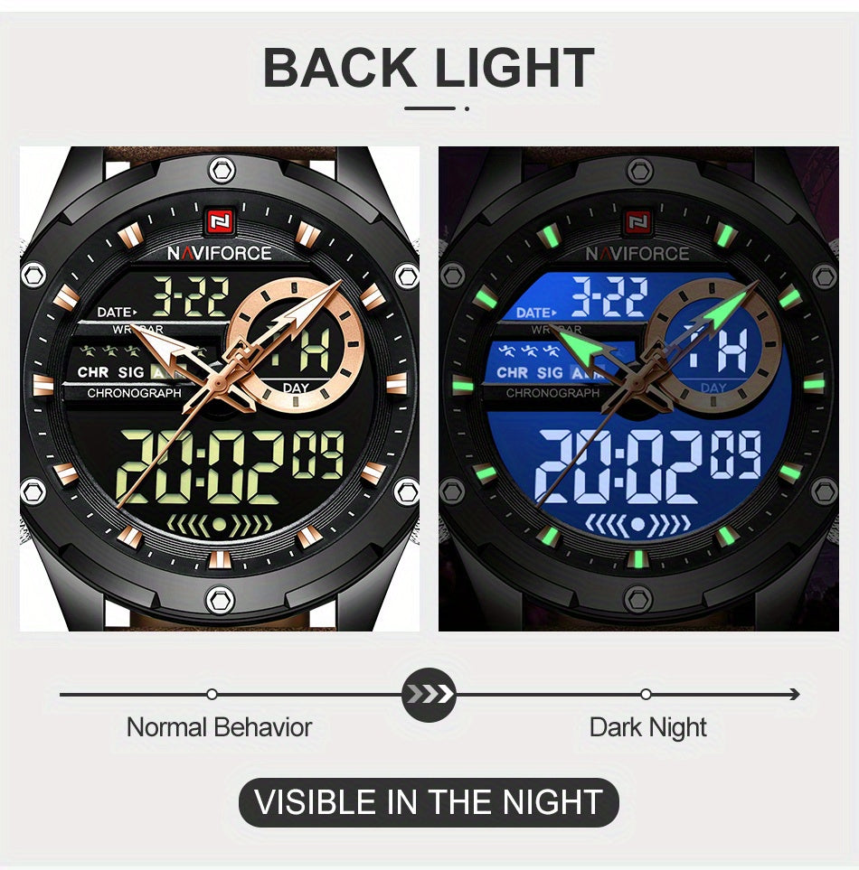 NAVIFORCE Men's Waterproof LED Dual Display Quartz Watch, Big Dial Chronograph Function Watch