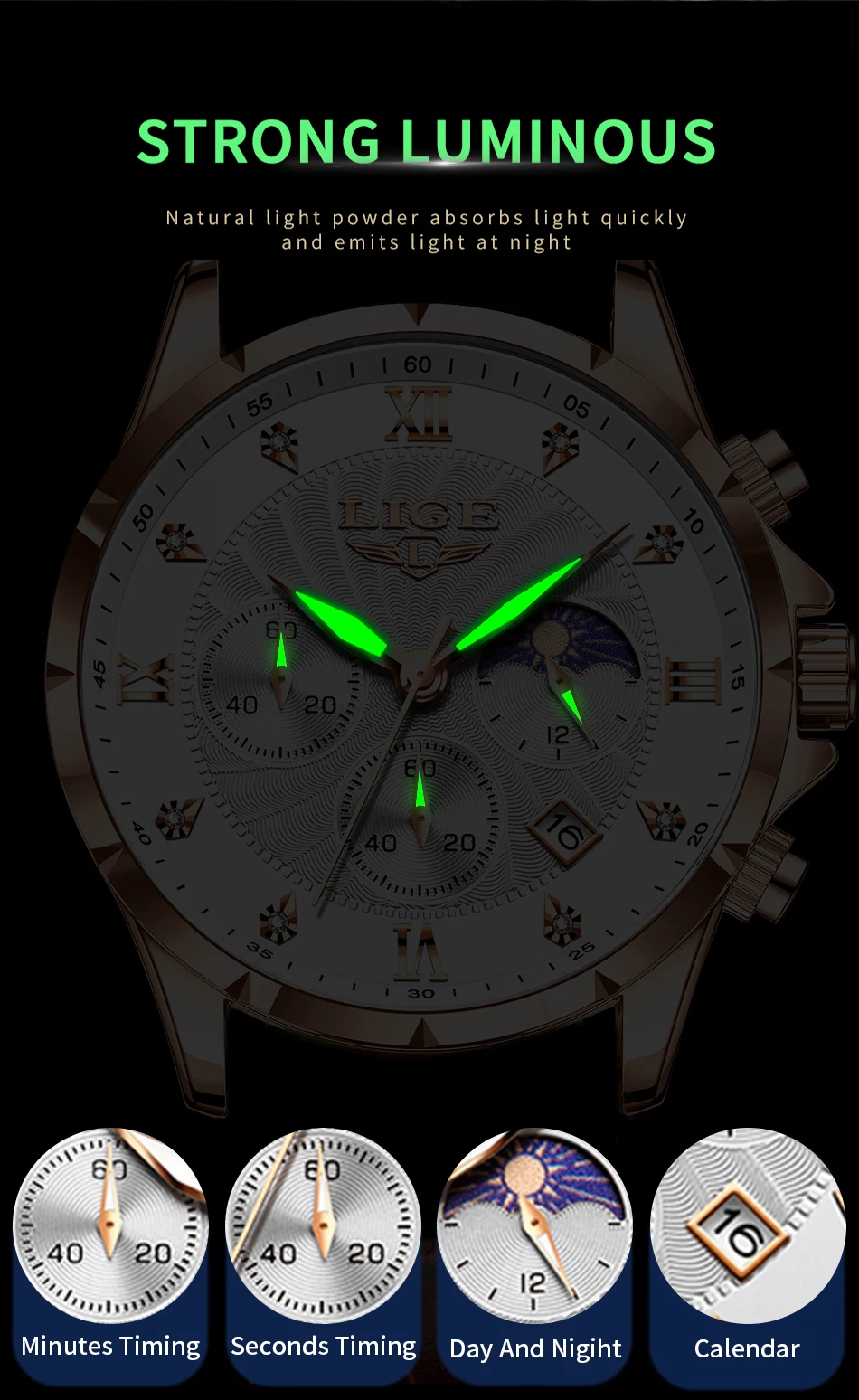 Feature: Stop Watch,Shock Resistant,Luminous,Auto Date,Chronograph,Water-Resistance,Luminous Hands