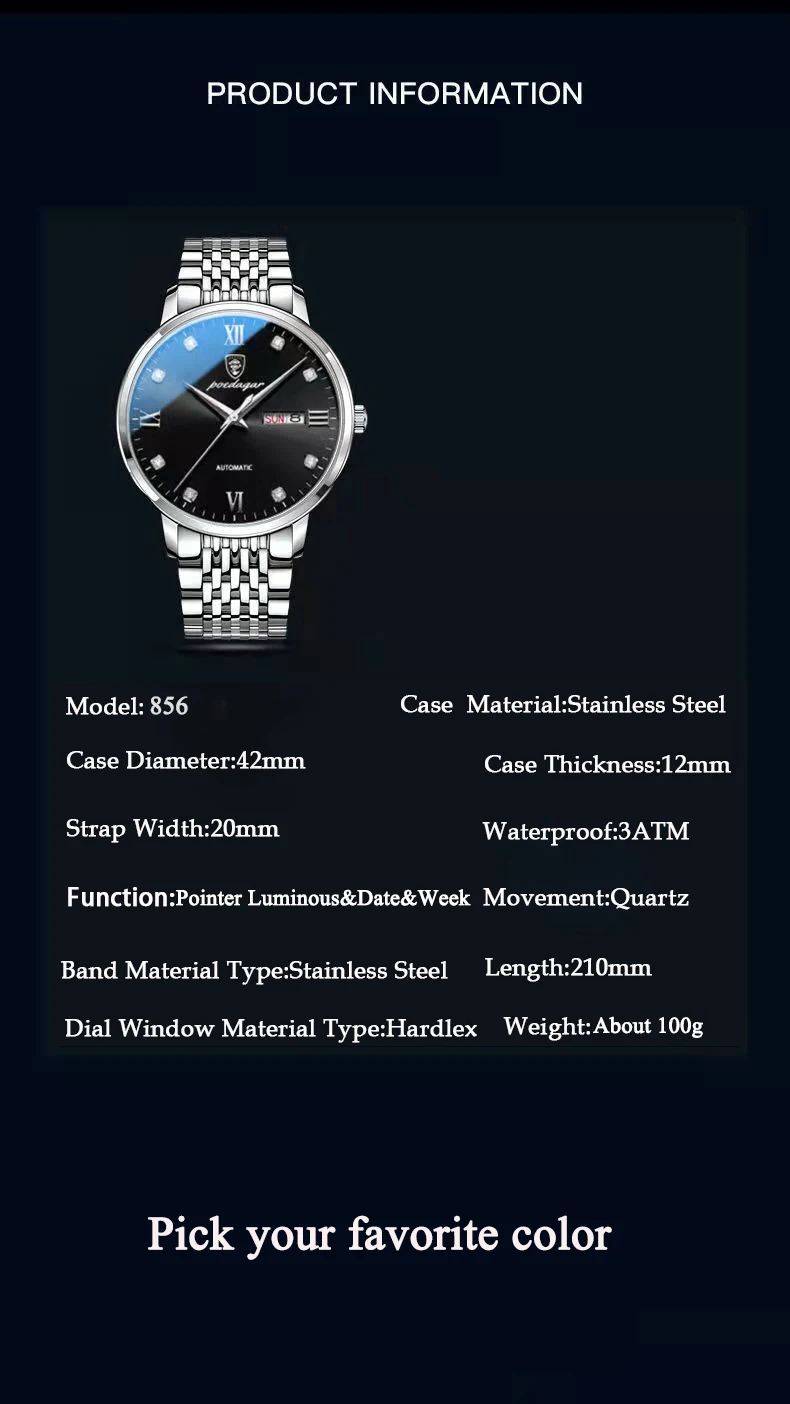 Feature: Auto Date,Day/Date,Waterproof,Luminous,Week Display,Luminous Hands