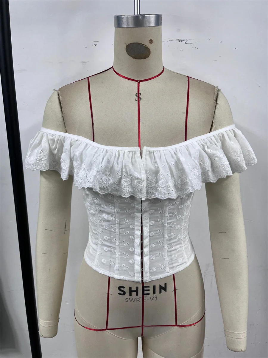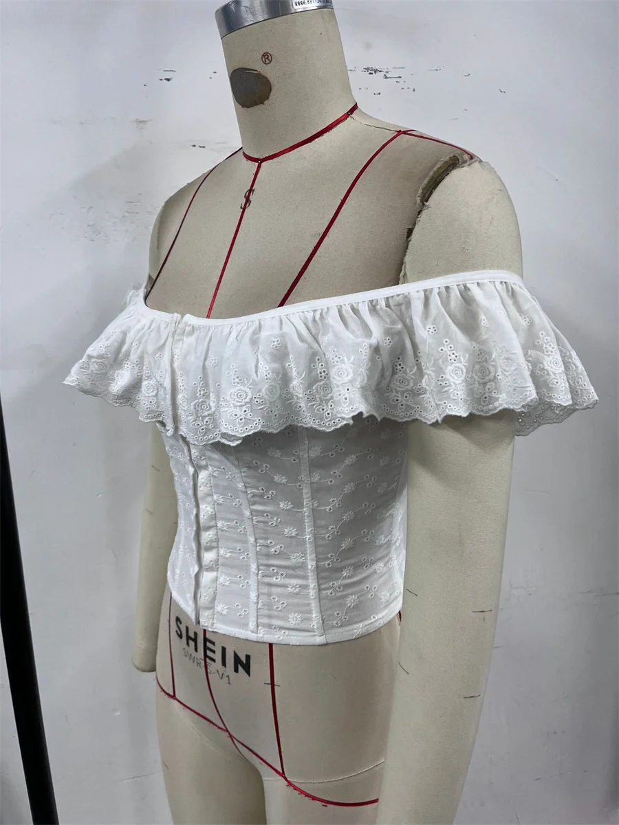 Women 2025 Elegant Lace Up Summer Tops One Shoulder Sweet Hollow Out Corset Lady Chic Crochet Flower Ruffled Sleeveless Camisole